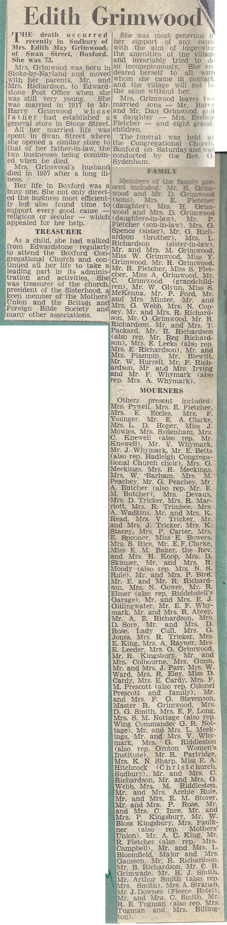 The death occurred recently in Sudbury of Mrs. Edith May Grimwood, of Swan Street, Boxford. She was 73.