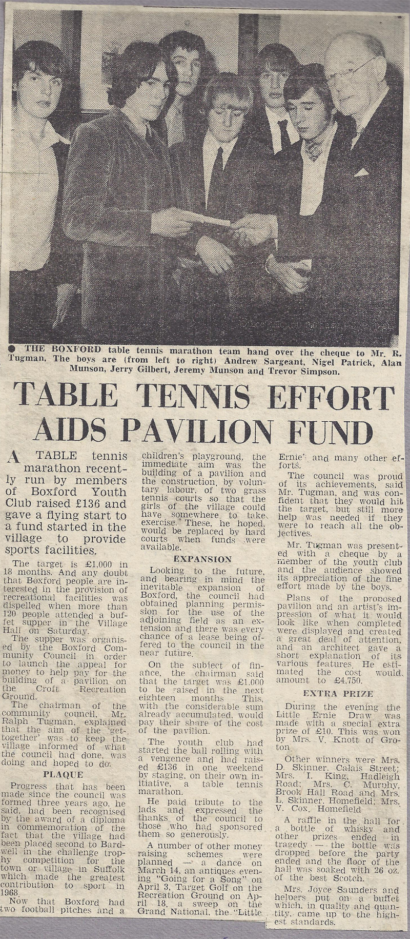 A table tennis marathon recently run by members of Boxford Youth Club raised £136 and gave a flying start to a fund started in the village to provide sports facilities.
