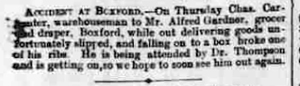 Accident at Boxford - On Thursday Chas. Carpenter, warehouseman to Mr. Alfred Gardner, grocer and draper, Boxford, while out delivering goods unfortunately slipped, and falling on to a box broke one of his ribs. He is being attended by Dr. Thompson and is getting on, so we hope to soon see him out again.