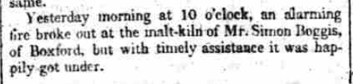 Yesterday morning at 10 c'clock, an alarming fire broke out at the malt-kiln of Mr. Simon Boggis, of Boxford, but with timely assistance it was happily got under.