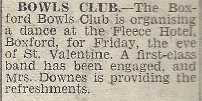 The Boxford Bowls Club is organising a dance at the Fleece Hotel, Boxford, for Friday, the eve of St. Valentine. A first class band has been engaged, and Mrs. Downes is providing the refreshments.