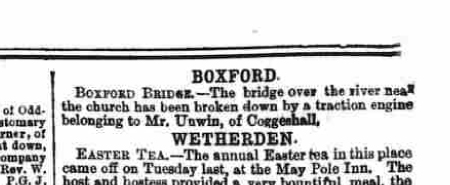 The bridge over the river near the church has been broken down by a traction engine belonging to Mr. Unwin, of Coggeshall.