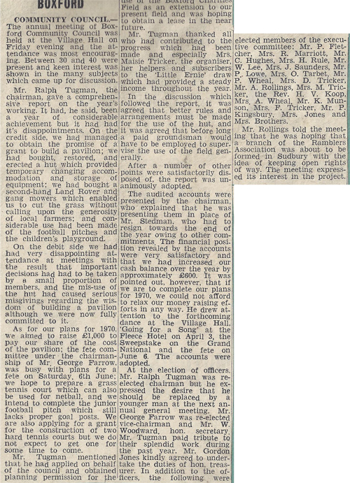 As for our plans for 1970, we aimed to raise £1,000 to pay our share of the cost of the pavilion; the fete committee under the chairmanship of Mr. George Farrow, was busy with plans for a fete on Saturday 6th June; we hope to prepare a grass tennis court which can also be used for netball, and we intend to complete the junior football pitch which still lacks proper goal posts. We are also applying for a grant for the construction of two hard tennis courts but we do not expect to get one for some time to come.