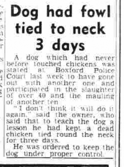 A dog which had never before touched chickens was stated at Boxford Police Court last week to have gone out with another one and participated in the slaughter of over 40 and the mauling of another ten.