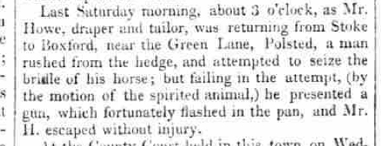 Last Saturday morning, about 3 o'clock, as Mr. Howe, draper and tailor, was returning from Stoke to Boxford, near the Green Lane, Polsted, a man rushed from the hedge, and attempted to seize the bridle of his horse; but failing in the attempt, (by the motion of the spirited animal,) he presented a gun, which fortunately flashed in the pan, and Mr. H. escaped without injury.
