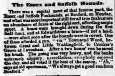 There was a capital meet of that famous pack, the Essex and Suffolk Foxhounds at Boxford, on Monday, and what was more important still for all true fox hunters an abundance of foxes of the right sort, affording ample sport. A brace were brought down during the first half-hour, and at Edwardstone a brace - if not a leash - were afoot soon after the hounds were in covert. One of these afforded a run, "via" Townsend Wood, between Great and Little Waldingfield, to Crocker's Grove at Lavenham. After a two hours' run he saved his brush. The going was very heavy, and the banks extremely slippery; nevertheless, everybody enjoyed the day, and all voted it the best of the season. "Ah," says an old sportsman, "We always get a good run from Boxford."