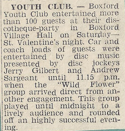 Boxford Youth Club entertained more than 100 guests at their discotheque-party in Boxford Village Hall on Saturday - St. Valentine's night. Car and coach loads of guests were entertained by disc jockeys Jerry Gilbert and Andrew Sargeant until 11.15 p.m. when the "Wild Flower" group arrived direct from another engagement. This group played until midnight to a lively audience and rounded off an highly successful evening.